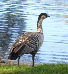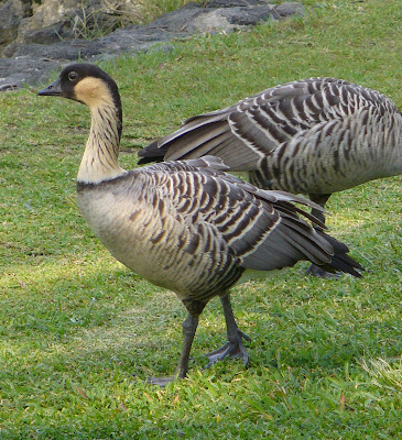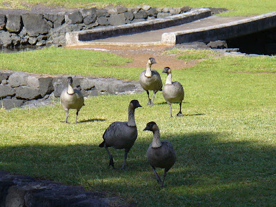 | Woody and I were taking a midday walk in Liliuokalani Park and ran into a veritable flock of our state bird, the Nene goose. Being the state bird, they mostly ignore people, so they just wandered up to where we were standing. |