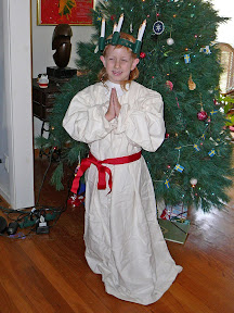 | They did a Santa Lucia thing at Max's school, but it was in the older grades. But Karin remembered that they had some Santa Lucia robes and electric candle wreath, so Max got to be Santa Lucia for Solstice. |